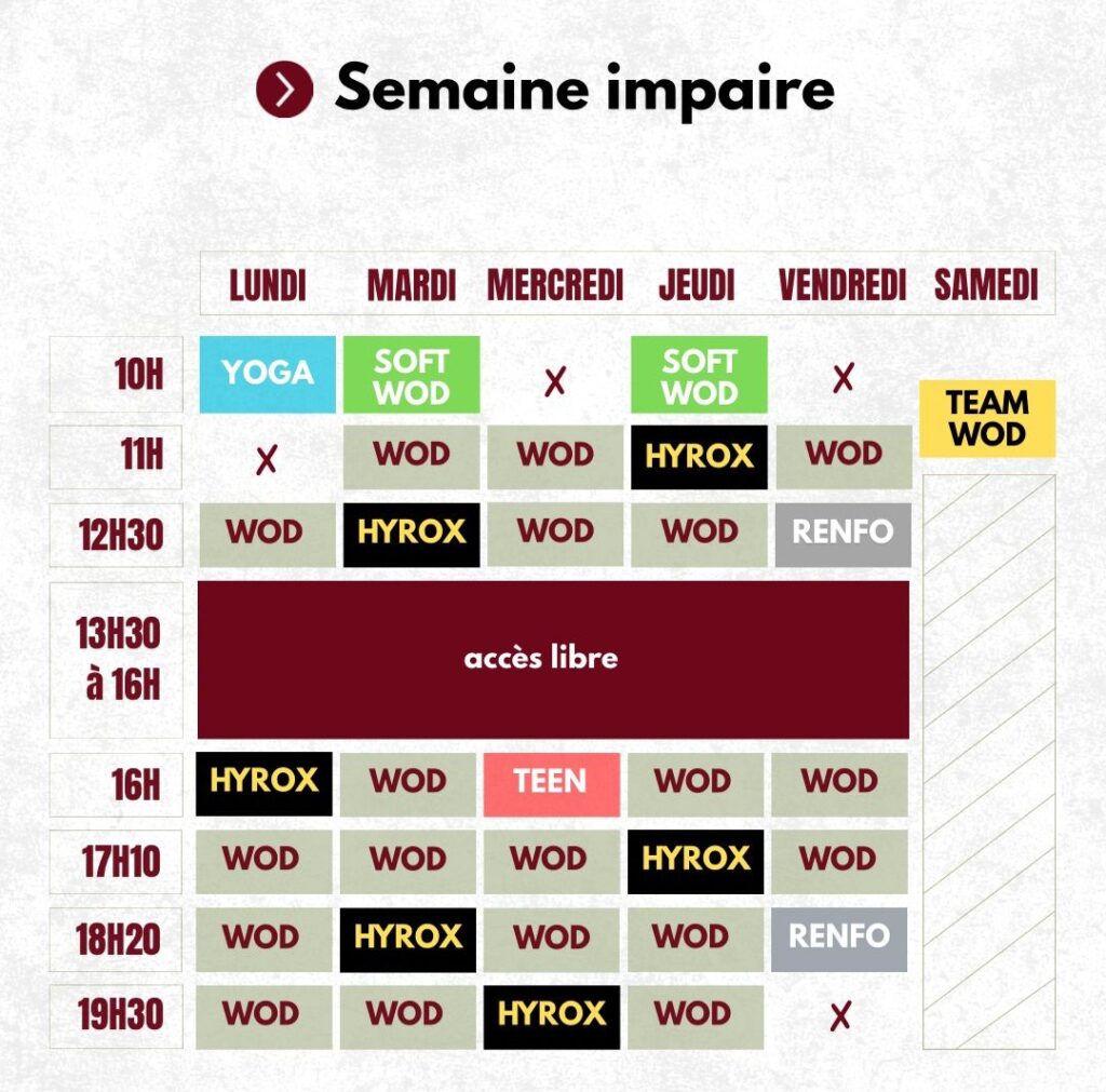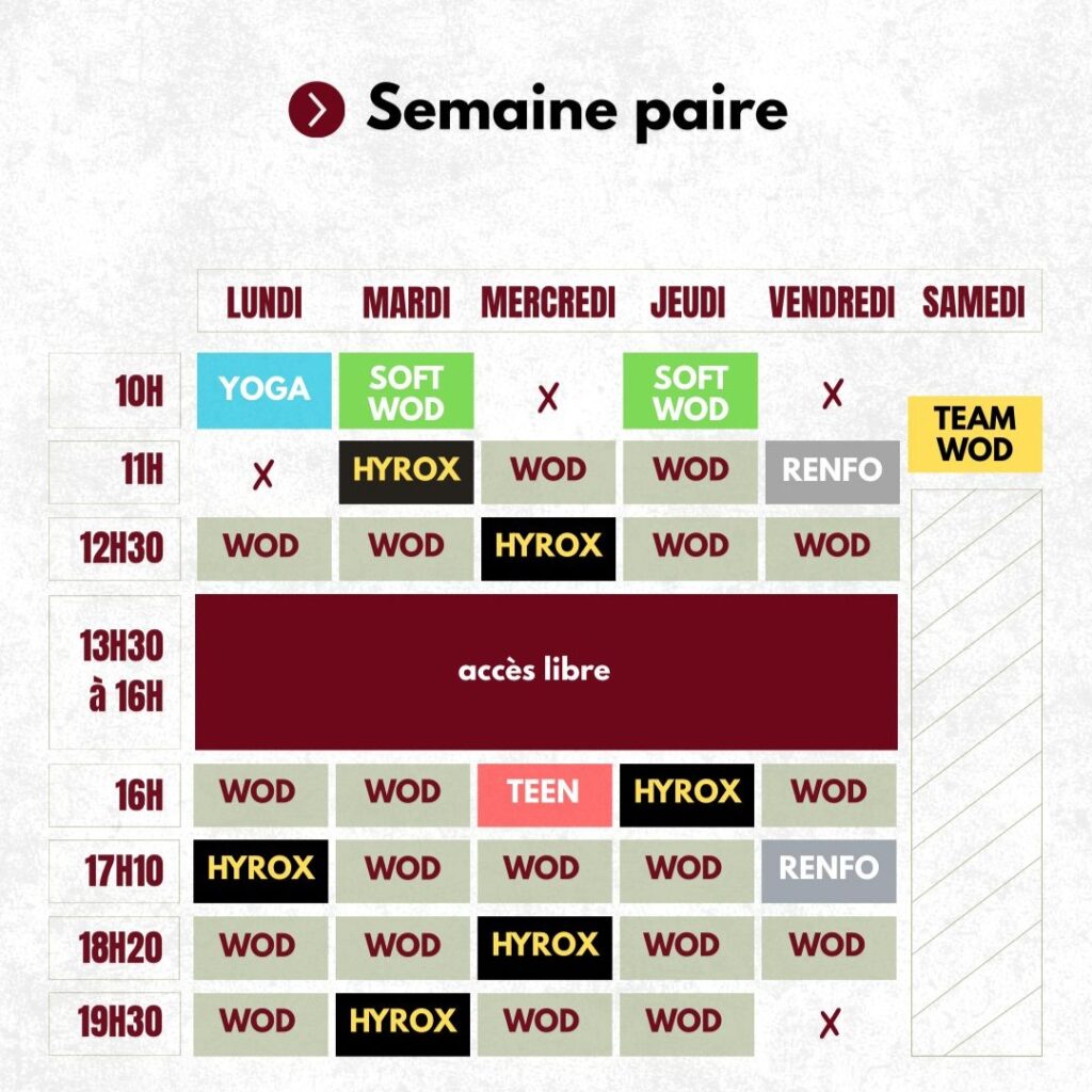 Chez CrossFit près de Bassens, nous vous proposons un planning structuré sur une rotation de semaines paires et impaires pour répondre à vos besoins d’entraînement tout en apportant diversité et équilibre.